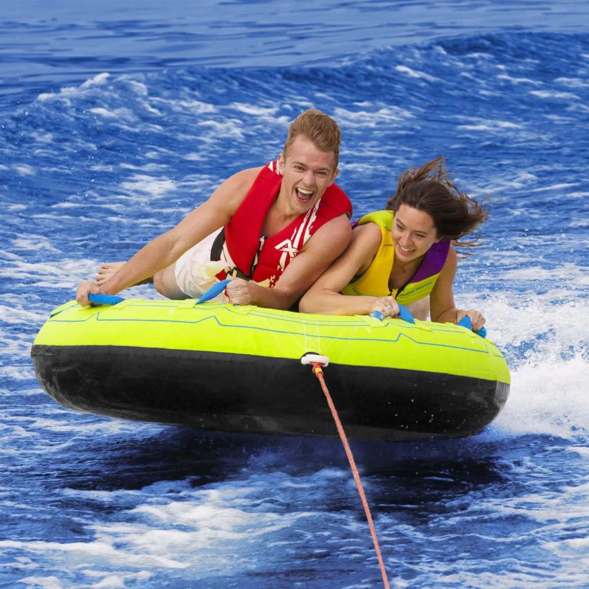 This 2 person deck tube carries a crowd with precision, and its large, flat shell makes it easy to slice through water and cut corners without losing control. This Airhead Comfort Shell 65 and 30-gauge RF welded PVC bladder are wrapped in heavy-duty plush neoprene foam. Add this to the foam-filled webbing handles and expertly-placed boarding straps, and you have the softest possible riding experience among all water tubes for boats.