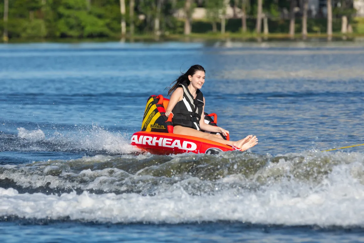 As a member of our best-selling Mable family, this 1 person towable tube features foam seating pads, cushioned side walls, and a supportive backrest for top-notch comfort and safety. Whether you’re cruising on low-gear or speeding over waves, 4 perfectly-placed double webbing foam handles help keep the rider on board. Plus, our Patented Speed Safety Valve and Kwik-Connect tow point make this chariot easy to attach and detach.