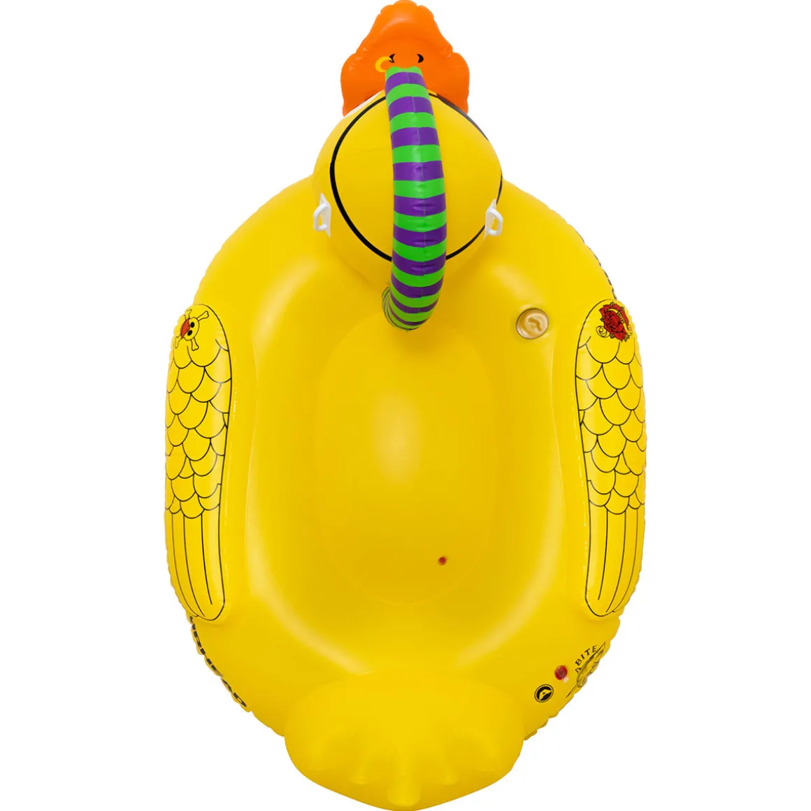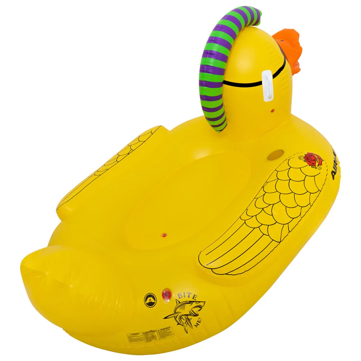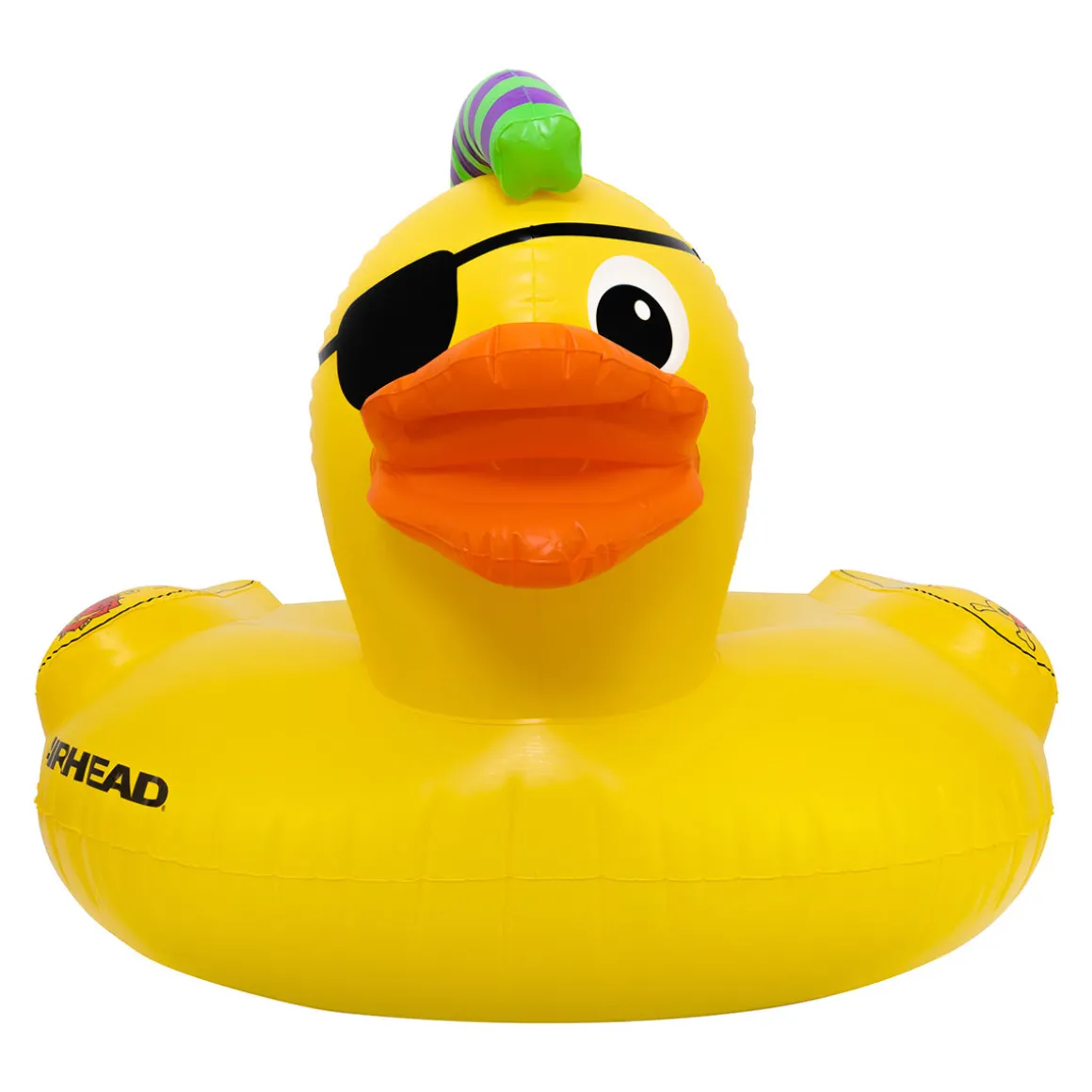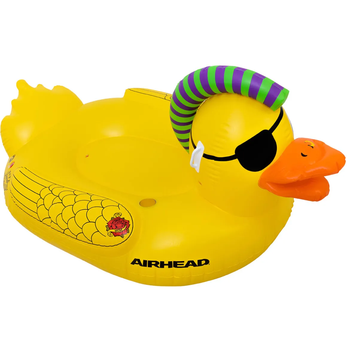 Ahoy, matey! Give your sea legs a rest with this Punk Duck plastic pool float. With a large yellow body, mohawk, eye patch, nose ring, and tattoos, this bad buccaneer will quickly become your go-to inflatable duck pool float for any party.