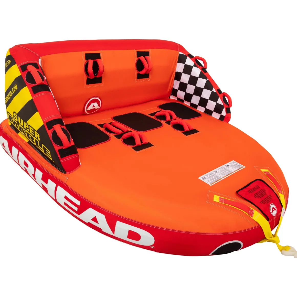 Airhead Super Mable is a 3 person towable tube that adds even more to the design we all know and adore. Discover all the classic features that Airhead tube lovers expect from the Big Mable—including a supportive backrest, top-notch safety features, foam seating pads, and dual tow points. This chariot-style towable tube holds up to three riders, making it perfect for family outings.