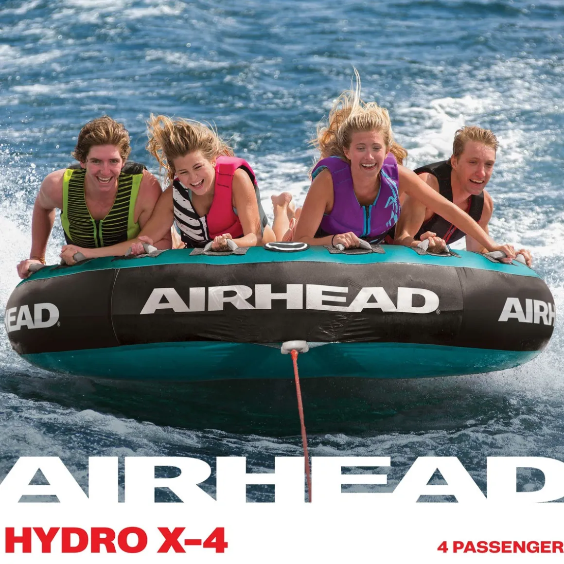 Hydro-X is a 4 person towable tube optimized for peak performance. Unlike ordinary deck tubes, Hydro-X is made with a tapered gusset design that slopes downward from the front to the back. This style provides a host of perks for riders and drivers, including an improved towing experience, more comfortable riding, and easy boarding from the water. The tapered edge also ensures maximum dexterity and control, both for towers and those being towed. Hydro-X provides an unforgettable day on the water through its topside neoprene panel, 8 nylon-wrapped handles, and comfortable knuckle guards. The durable 30 gauge virgin PVC bladder is fully encased by a rugged 840 denier double-stitched nylon cover with a reinforced internal tow harness. This makes it far more dependable than ordinary inflatable tubes for boats. Hydro-X is safe and convenient, too. It’s equipped with a Speed Safety Valve for fast inflating and deflating, ensuring it’s always easy to have a day on the water.